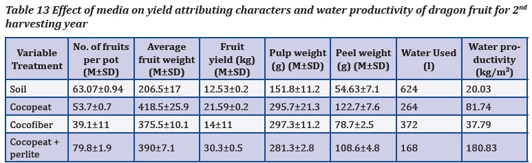 The cocopeat + perlite combination produced the best results, yielding higher peel weight (121 g vs. 41 g), pulp weight (283 g vs. 111 g), and total soluble solids (TSS) (17.4°Brix vs. 16.85°Brix), indicating the development of larger and more nutrient-rich fruits. Cocopeat and its variants, particularly when combined with perlite, improved aeration while significantly reducing water usage (168 L vs. 624 L in soil). The Pruning intensity also influenced plant productivity: severe pruning (80% removal) increased fruitful cladodes (39.5% vs. 20.31%), moderate pruning (60% removal) enhanced fruit set (87.42% vs. 68.20%), and light pruning stimulated new sprout growth (23.3 vs. 8.1).