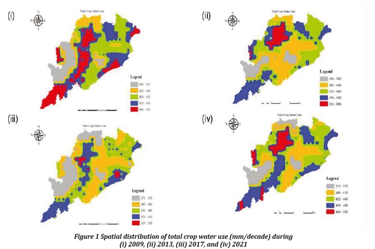 The water footprint (WF) of crop production in Odisha from 2009 to 2021 exhibited significant spatial and temporal variations influenced by climate, crop yield, and irrigation practices. The total WF decreased from 650–7900 m³/t in 2009 to 510–3300 m³/t in 2021, attributed to improved agricultural practices and efficient water management. Jharsuguda, Sundergarh, and Sambalpur had the highest WF due to low rainfall and irrigation dependency, while districts like Balasore and Gajapati had lower WF due to better rainfall utilization.