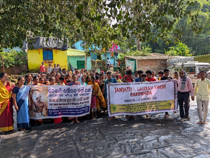 As part of the observance of Janjatiya Gaurav Varsh Pakhwada commemorating the 150th Birth Anniversary of Bhagwan Birsa Munda, a Tribal Farmers’ awareness programme was organized by our institute in Village: Chargaon in Koraput district (Odisha) on “Health and Wellness”. The program aimed to create awareness on health units, nutrition, AYUSH practices, and disease screening among tribal farmers. A total of 42 male and 60 female tribal farmers from the village attended the event. A local NGO “Pragati” and ICAR-IISWC, Koraput Centre collaborated with our institute in organizing and facilitating the activities. Local Anganwadi Didi and Asha Didi explained the tribal farm women on maintaining proper health and sanitation in the village. Expert scientists from ICAR-IIWM, Bhubaneswar, ICAR-IISWC, Koraput and Team Leader from Pragati interacted with the participants and highlighted the life history of Bhagawan Birsa Munda. Participants expressed keen interest in adopting AYUSH-based lifestyle practices for improved well-being. The event concluded with a group pledge to promote health awareness and wellness in tribal communities.