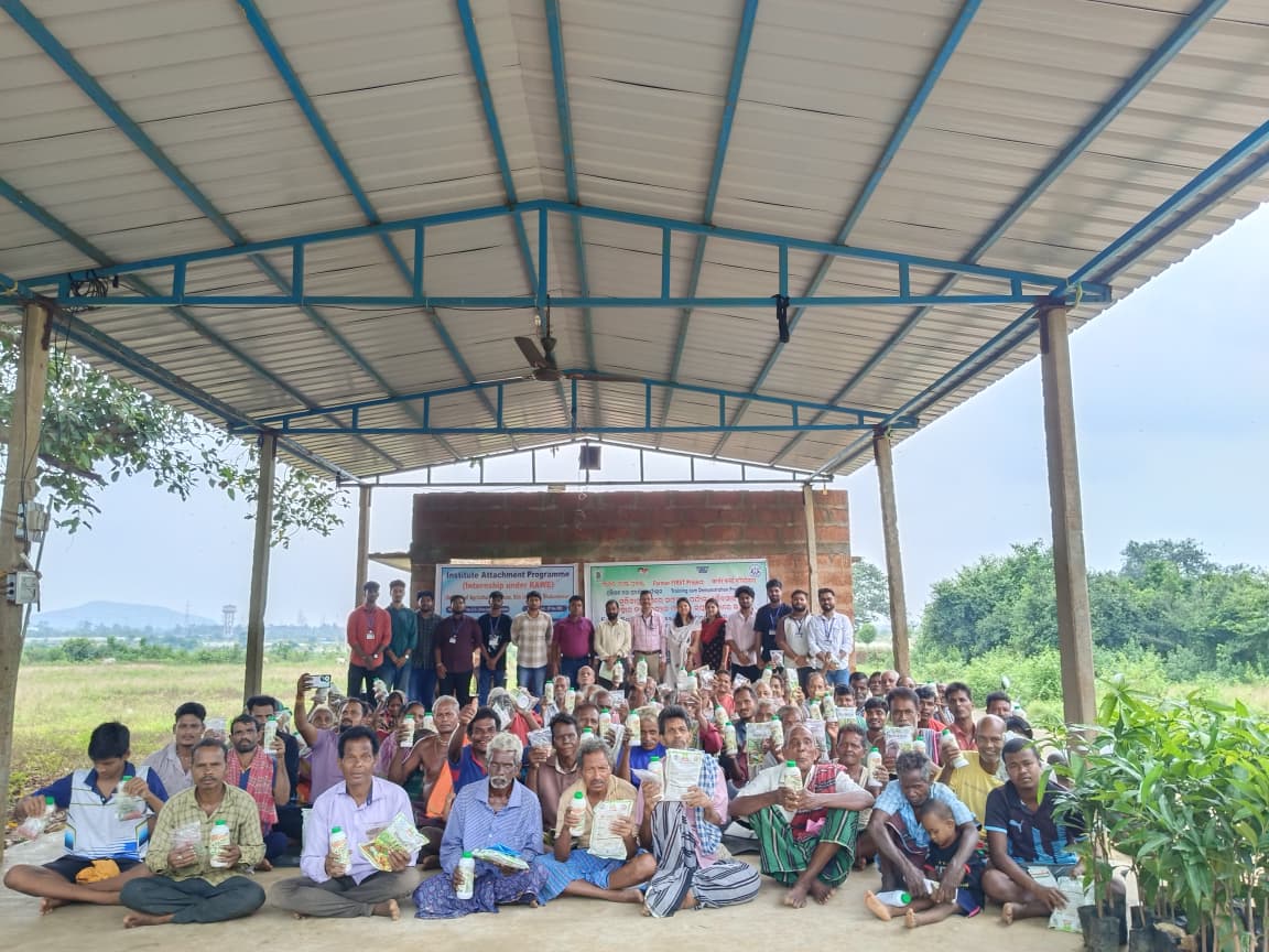 An off-campus training-cum-demonstration programme on the topic “From Soil to Success: Elevating Productivity of Horticultural Crops with Bio-Fertilizers” was organized on 23rd September, 2025 under the ‘Farmer FIRST Project’ of ICAR-IIWM, Bhubaneswar, benefiting 65 trainee farmers and farmwomen from the adopted village cluster, namely, Haridamada, Jamujhari and Barapita of Khordha district, besides 10 B.Sc. (Ag) 4th Year students from SOA University, Bhubaneswar who were undergoing RAWE Internship Programme at the Institute. At the outset, Dr. S.K. Mishra, Principal Scientist and PI of the project, welcomed the participants and emphasized on the importance of soil health management and the crucial role of bio-fertilizer application in enhancing the productivity and sustainability of horticultural crops. He highlighted the significance of reducing dependency on chemical fertilizers through integrated nutrient management practices. Dr. Prativa Sahu, Scientist & Co-PI of the project, demonstrated different methods on applying bio-fertilizers such as seed treatment and seedling root dip treatment. Dr. Sahu also highlighted, use of bio-fertilizers not only reduces the cost of cultivation but also ensures eco-friendly crop production and protection. She explained in detail, how microbial inoculants like Azospirillum, Azotobacter, Rhizobium, and Phosphate Solubilizing Bacteria (PSB) help in improving nutrient availability, soil fertility, and crop resilience. For undertaking field demonstrations, bio-fertilizers like PSB, Trichoderma viridae, Azotobacter, Rhizobium, and rabi season vegetable seeds were distributed to the participating farmers. Subsequently, a “Swachhata Awareness-cum-Cleanliness” drive was organized through shramdaan under the ‘Swachhata Hi Seva’ Campaign with the enthusiastic participation of all trainees, students, resource persons and some villagers to clean the village main road, cutting of roadside bushes, and trimming of avenue plants. On this occasion, grafted mango saplings were distributed to all participants aligning the national campaign on “Ek Ped Maa Ke Naam” and “Meri LiFE”, symbolizing community commitment towards cleanliness, environmental conservation, and collective responsibility. The programme concluded with a formal vote of thanks by Ms. Isha Anindita Sahoo, SRF, acknowledging the active participation of farmers, students and valuable contributions of the resource persons.