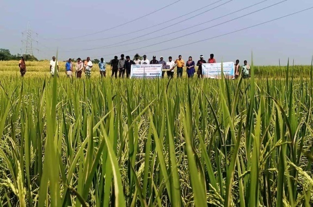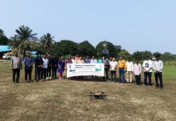 One ‘Farmers’ Field Day’ was conducted in the Farmer FIRST Project adopted Haridamada village in Khordha on 7th November, 2025 involving about forty beneficiary as well as non-beneficiary farmers, 4th year B.Sc. (Ag) students from SOA University, project scientists and staff. The participants visited the kharif demonstration fields of HYV varieties namely, ‘CR Dhan 409’ (a shallow lowland rice variety of 160 days duration); ‘CR Dhan 801’ (a medium lowland climate smart rice variety of 145 days duration, resistant to both drought and submergence); and ‘Pooja’ (a shallow lowland fine grain rice variety of 150 days duration) covering an area of about 100 acres in the adopted cluster comprising Haridamada, Jamujhari and Barapita villages. Since, all the varieties were either at reproductive or maturity stages, the students and farmers could clearly observe and critically evaluate the performance of the demonstrated rice varieties vis-à-vis other farmer grown varieties in the cluster with various physical parameters like, plant height, no. of heels/mt2, no. of tillers/heel, no. grains/panicle, diseases-pest infestation, and robustness of crops etc. The students interacted with the farmers and were exposed to water, nutrient and overall crop management practices for getting higher water and crop productivity. All the participants were oriented on maintaining seed purity of harvested crops with proper rouging at critical stages and post-harvest management practices in order to qualify to standard seed production protocols. This would help the farmers to sell the produce as seeds at much higher price (50-100%) over and above the MSP. Besides, the participants also visited the nearby ‘One-acre Natural Farming Model’ demonstration plot with rice variety ‘Kalachampa’. They were exposed to Natural Farming protocols of growing crops like, preparation and application of Beejamrut, Ghanamrut (using fresh dung & urine of indigenous cows, jaggery, live soil etc) for nutrient requirements and Bhahmastra for controlling diseases and pests. Later, the participants were exposed to the demonstrations on ‘Applications of Imaging Drone in Agriculture’ at the nearby ICAR-IIWM Research Farm at Mendhasal. The programme was participated and coordinated by Dr. S.K. Mishra, PS & PI; Dr. D. Sethi, Scientist & Co-PI; Ms. Isha Anindita Sahoo, SRF and Mr. F.K. Pradhan, Field Assistant besides the active participation of farmers and students. Some of the action photographs of the day are given below.