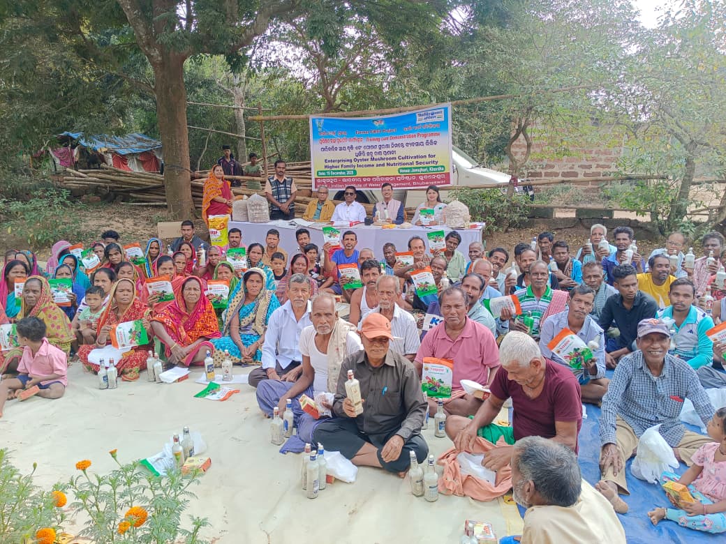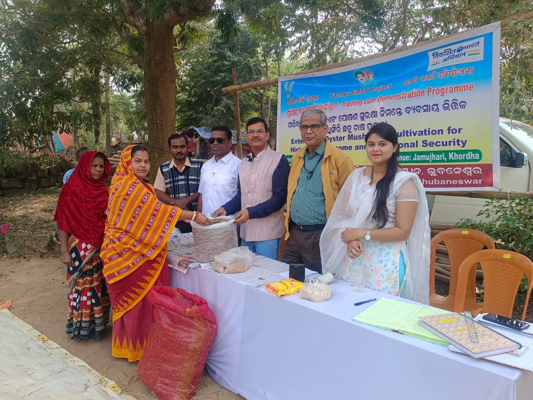 A skill-based training cum demonstration programme on “Enterprising Oyster Mushroom Cultivation for Higher Family Income and Nutritional Security” was successfully conducted on 19th December, 2025 in Jamujhari village under the Farmer FIRST Project. The training was attended by over 90 enterprising farmers and youths from three adopted villages, namely Haridamada, Jamujhari and Barapita of Khordha district. In his opening remarks, Dr. Sumanta Kumar Mishra, Principal Scientist and PI discussed on enormous health benefits of oyster mushroom as an amazing nutritious food and how farmers can become atmanirbhar (self-reliant) adopting this as a business module. He mentioned this enterprising crop requires low investment and could be taken up as an alluring enterprise even by landless, small and marginal farmers. He added, one can get his/her return from investment in a short time span and recycle the investment round the year and briefed its benefit-cost analysis. He also advised all to desist from straw burning practice which has severe adverse environmental impacts Dr. Bhabani Sankar Satapathy, Senior Scientist and Co-PI explained on how to prepare the mushroom beds scientifically in a village situation. He emphasized that the discarded straw in the rice field after machine-harvesting of paddy can be economically utilized for mushroom cultivation to increase family income. He also provided valuable guidance that the partially decomposed paddy straw after harvest of mushroom can be effectively used for making better compost as well as for vermi-compost preparation. Later, all scientists, technical staff Dr. Subodha Kumar Karna and project staff coordinated a skill-oriented demonstration in preparing suitable mushroom beds with the active involvement of participants. As critical inputs, 200 nos. oyster mushroom spawn bottles with required polythene bags and NHRDF vegetable seed kits were provided to all participants. In the beginning, Ms. Isha Anindita Sahoo, SRF welcomed the participants and coordinated the event, while at the end, Mr. Firoj Kumar Pradhan, Field Assistant proposed vote of thanks.