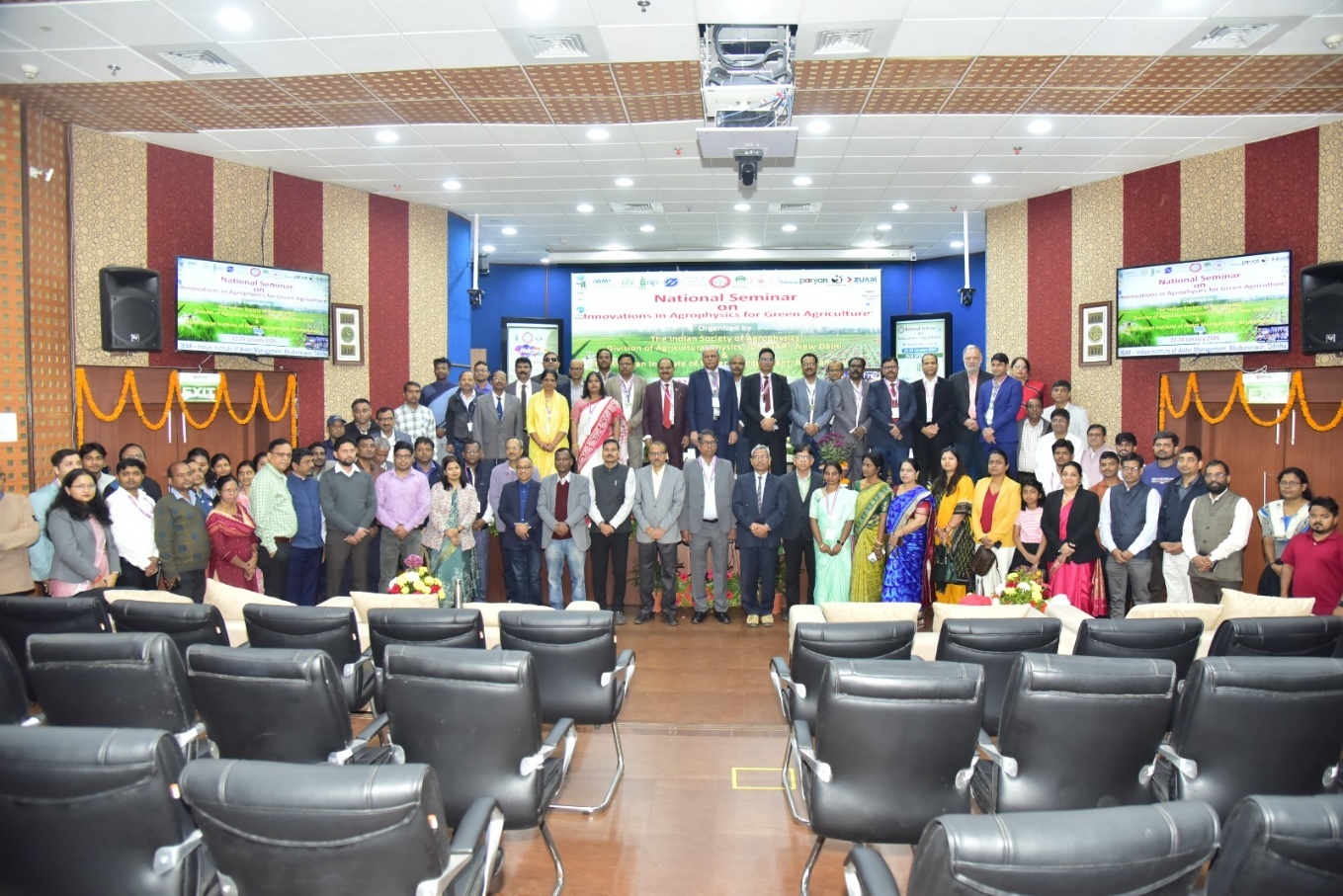 The Indian Society of Agrophysics, New Delhi in collaboration with ICAR-Indian Institute of Water Management, Bhubaneswar organized a National Seminar on “Innovations in Agrophysics for Green Agriculture” during 22–24 January 2026 at ICAR-Indian Institute of Water Management, Bhubaneswar. The Indian Society of Agrophysics is a society of professionals working in the field of Agricultural Physics and allied disciplines with the main objective of promoting research, education and training. The Seminar focussed on core aspects of digitization of agriculture integrating cutting edge digital technology into the farm production system and natural resource management, including artificial intelligence, Big Data Analytics, drone, remote sensing, sensors, and communication networks. Presently Dr. N. Subash, Head. Division of Agricultural Physics, Indian Agricultural Research Institute, New Delhi is the President of the Society and Dr. Pragati Pramanik Maity, Principal Scientist is the Secretary of the Society. The Chief guest of the inaugural session of the seminar was Dr. S.K. Chaudhari, DG, FAI, New Delhi. Dr. Arjamadutta Sarangi, Director, ICAR-IIWM, Bhubaneswar was the Chairman of Organizing Committee and Dr. K.K. Bandyopadhyay, Programme Leader (Canal Water Management) was the Organizing Secretary of the National Seminar. The inaugural program was followed by 12th Dr. B.P. Ghildyal Memorial Lecture to delivered by Dr. Ch. Srinivasa Rao Director, ICAR-IARI, New Delhi on the topic “Innovations for green farming”. The 12th Dr. B.P. Ghildyal Memorial Lecture was chaired by Dr. S K Chaudhari, DG, FAI, New Delhi. Several distinguished dignitaries like Dr. Pradip Day, Dr. Manoranjan Mohanty, Dr. A.K. Patra, Dr Y S Shivay graced the Seminar. The lecture galvanized the participants towards the cutting-edge research on India’s preparedness towards climate resilient agriculture. The seminar includes different technical sessions including oral and poster presentations divided into four themes viz., (i) Artificial Intelligence/machine learning, robotics, big data analytics/Meteorology/ Remote Sensing/ GIS; (ii) Soil Science/Soil Physics/Biophysics/Biosensors; (iii) Precision nutrient and water management, wireless sensors, smartphone application in agriculture and (iv) Soil and Water Conservation and Climate Risk Management, Conservation Agriculture and Organic Farming. There was total 30 oral and 45 poster presentations including five lead lectures delivered by eminent scientists working on different aspects of agrophysics. There were two special sessions i.e. “Futuristic Fertilizer Management for Green Agriculture” sponsored by FAI, New Delhi and “Climate Smart Water Management for Green Agriculture” sponsored by International Water Management Institute, Colombo during this seminar. The seminar was attended by about 200 delegates including Scientists, Research Associates, young professionals and students from different ICAR Research Institutes, State Agricultural Universities, NGOs, Farmers and other different private sector companies from all over India. Different ICAR institutes and instrument companies also displayed their findings in exhibition stalls. The chief guest of the valedictory ceremony of this seminar was Dr. K. Yella Reddy, Vice President, International Cooperation of Irrigation and Drainage. Dr. K.K. Rout, Dean, School of Agriculture, Driems University was the guest of honour on this occasion. There was wide media coverage of this programme in local newspapers and television. The deliberations from this seminar highlighted the impact of different agrophysical technologies for bringing evergreen revolutions in agriculture.