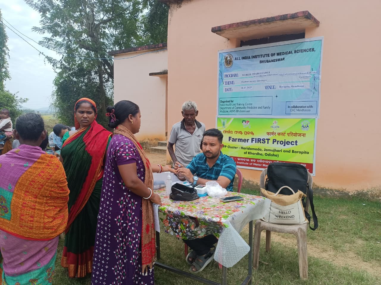 A special Health Awareness Camp was organized on 20th November, 2025 in the Barapita tribal village of Khordha, adopted under the ICAR-IIWM Farmer FIRST Project, in collaboration with AIIMS, Bhubaneswar as part of the observance of World Diabetes Day held recently. At the outset, Dr. S.K. Mishra, Principal Scientist & PI and Dr. Prativa Sahu, Scientist welcomed the AIIMS medical team, as well as participating villagers and briefed them about the importance of organizing the health awareness cum screening programme in the village. The medical team of twelve members comprising doctors and paramedical staff like nurses and technicians, led by Dr. Niraja Guru, Assistant Professor from the Dept. of Community Medicines & Family Medicines, AIIMS, Bhubaneswar conducted the camp. They made general health check-ups including body weight, height, blood haemoglobin level, diabetes screening, blood pressure monitoring, and provided medical consultations to the villagers. Essential medicines were also distributed free of cost and need-based health advisories were provided. A total of over 80 villagers, including men, women including pregnant, children and elderly persons of the village actively participated in the camp and got benefited. The villagers appreciated the initiative, expressed that such health services were extremely valuable for remote tribal areas, where regular medical facilities are limited. The camp focused on raising awareness about diabetes, its symptoms, prevention strategies, dietary practices, and lifestyle modifications. Doctors emphasized the importance of early detection and timely management to reduce long-term health complications. Interactive discussions were held to clarify doubts and encourage the community to adopt healthier daily habits. The programme highlighted the project’s commitment to holistic development by integrating health, nutrition, and livelihood security for tribal households. It concluded successfully with strong community engagement and active participation, supported by the dedicated efforts of Ms. Isha Anindita Sahoo, SRF, and Mr. Firoj Kumar Pradhan, Field Assistant of the project, who effectively coordinated the village-level activities.