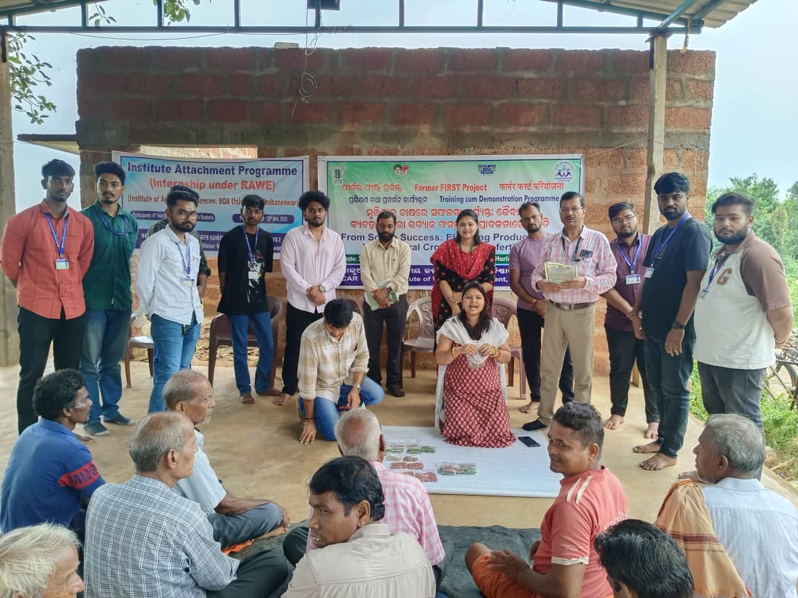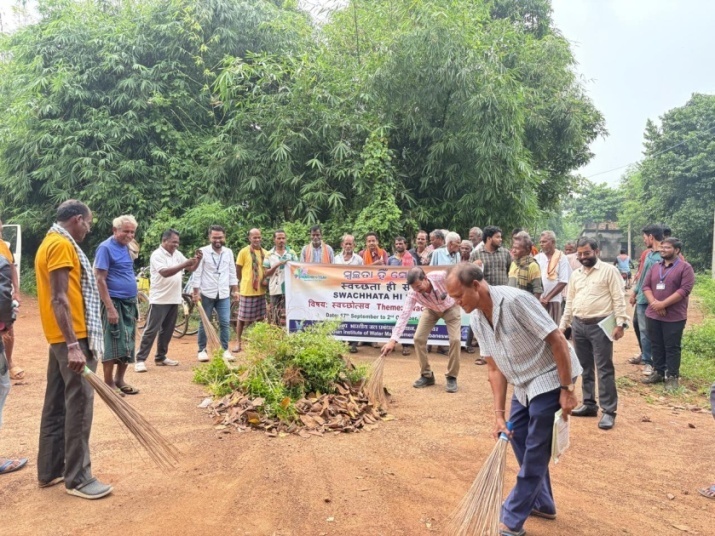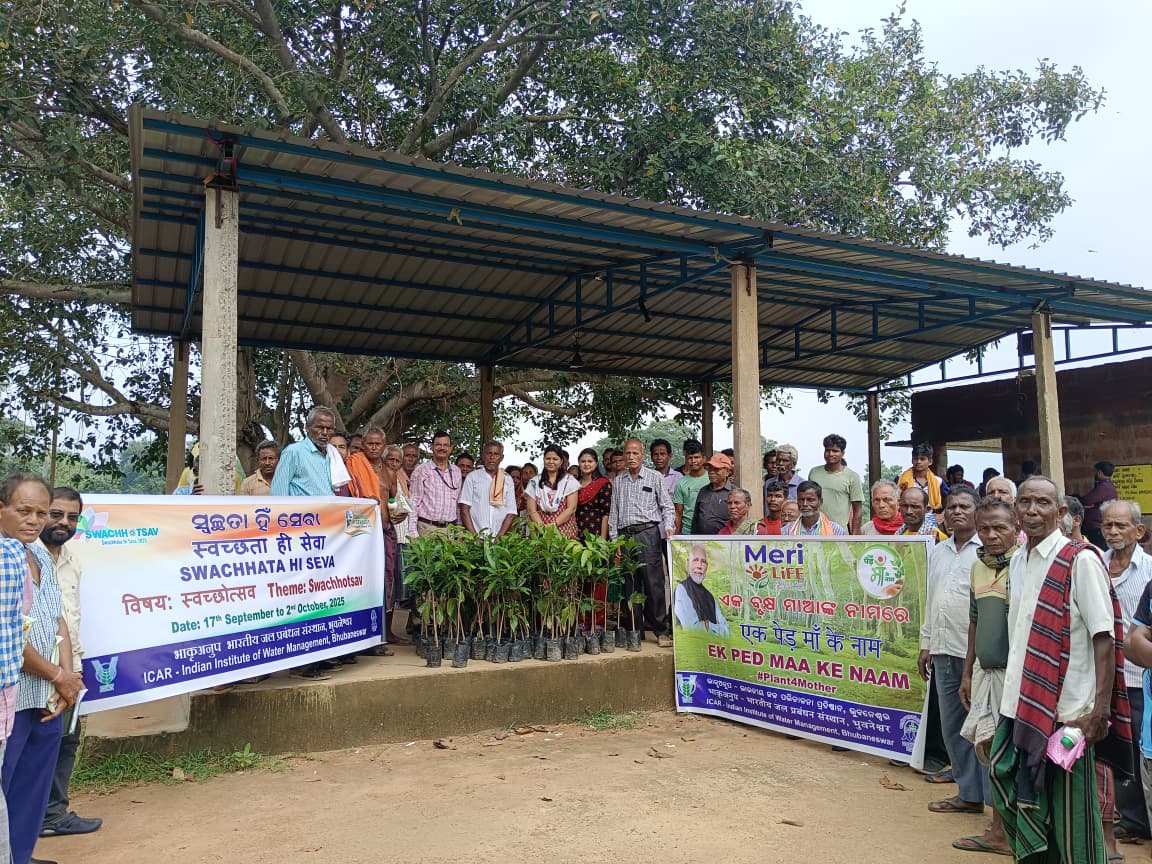 An off-campus training-cum-demonstration programme on the topic “From Soil to Success: Elevating Productivity of Horticultural Crops with Bio-Fertilizers” was organized on 23rd September, 2025 under the ‘Farmer FIRST Project’ of ICAR-IIWM, Bhubaneswar, benefiting 65 trainee farmers and farmwomen from the adopted village cluster, namely, Haridamada, Jamujhari and Barapita of Khordha district, besides 10 B.Sc. (Ag) 4th Year students from SOA University, Bhubaneswar who were undergoing RAWE Internship Programme at the Institute. At the outset, Dr. S.K. Mishra, Principal Scientist and PI of the project, welcomed the participants and emphasized on the importance of soil health management and the crucial role of bio-fertilizer application in enhancing the productivity and sustainability of horticultural crops. He highlighted the significance of reducing dependency on chemical fertilizers through integrated nutrient management practices. Dr. Prativa Sahu, Scientist & Co-PI of the project, demonstrated different methods on applying bio-fertilizers such as seed treatment and seedling root dip treatment. Dr. Sahu also highlighted, use of bio-fertilizers not only reduces the cost of cultivation but also ensures eco-friendly crop production and protection. She explained in detail, how microbial inoculants like Azospirillum, Azotobacter, Rhizobium, and Phosphate Solubilizing Bacteria (PSB) help in improving nutrient availability, soil fertility, and crop resilience. For undertaking field demonstrations, bio-fertilizers like PSB, Trichoderma viridae, Azotobacter, Rhizobium, and rabi season vegetable seeds were distributed to the participating farmers. Subsequently, a “Swachhata Awareness-cum-Cleanliness” drive was organized through shramdaan under the ‘Swachhata Hi Seva’ Campaign with the enthusiastic participation of all trainees, students, resource persons and some villagers to clean the village main road, cutting of roadside bushes, and trimming of avenue plants. On this occasion, grafted mango saplings were distributed to all participants aligning the national campaign on “Ek Ped Maa Ke Naam” and “Meri LiFE”, symbolizing community commitment towards cleanliness, environmental conservation, and collective responsibility. The programme concluded with a formal vote of thanks by Ms. Isha Anindita Sahoo, SRF, acknowledging the active participation of farmers, students and valuable contributions of the resource persons.