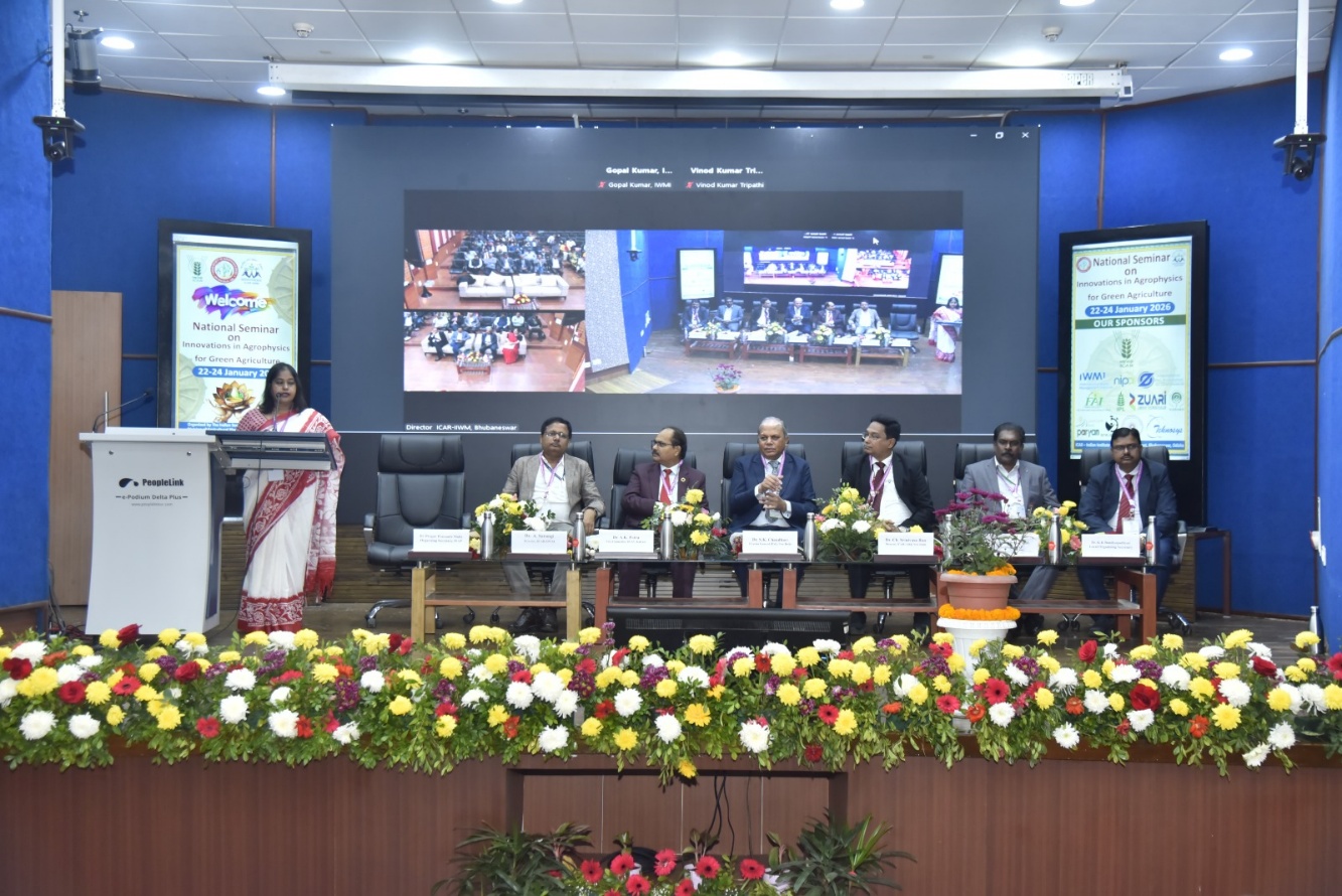 The Indian Society of Agrophysics, New Delhi in collaboration with ICAR-Indian Institute of Water Management, Bhubaneswar organized a National Seminar on “Innovations in Agrophysics for Green Agriculture” during 22–24 January 2026 at ICAR-Indian Institute of Water Management, Bhubaneswar. The Indian Society of Agrophysics is a society of professionals working in the field of Agricultural Physics and allied disciplines with the main objective of promoting research, education and training. The Seminar focussed on core aspects of digitization of agriculture integrating cutting edge digital technology into the farm production system and natural resource management, including artificial intelligence, Big Data Analytics, drone, remote sensing, sensors, and communication networks. Presently Dr. N. Subash, Head. Division of Agricultural Physics, Indian Agricultural Research Institute, New Delhi is the President of the Society and Dr. Pragati Pramanik Maity, Principal Scientist is the Secretary of the Society. The Chief guest of the inaugural session of the seminar was Dr. S.K. Chaudhari, DG, FAI, New Delhi. Dr. Arjamadutta Sarangi, Director, ICAR-IIWM, Bhubaneswar was the Chairman of Organizing Committee and Dr. K.K. Bandyopadhyay, Programme Leader (Canal Water Management) was the Organizing Secretary of the National Seminar. The inaugural program was followed by 12th Dr. B.P. Ghildyal Memorial Lecture to delivered by Dr. Ch. Srinivasa Rao Director, ICAR-IARI, New Delhi on the topic “Innovations for green farming”. The 12th Dr. B.P. Ghildyal Memorial Lecture was chaired by Dr. S K Chaudhari, DG, FAI, New Delhi. Several distinguished dignitaries like Dr. Pradip Day, Dr. Manoranjan Mohanty, Dr. A.K. Patra, Dr Y S Shivay graced the Seminar. The lecture galvanized the participants towards the cutting-edge research on India’s preparedness towards climate resilient agriculture. The seminar includes different technical sessions including oral and poster presentations divided into four themes viz., (i) Artificial Intelligence/machine learning, robotics, big data analytics/Meteorology/ Remote Sensing/ GIS; (ii) Soil Science/Soil Physics/Biophysics/Biosensors; (iii) Precision nutrient and water management, wireless sensors, smartphone application in agriculture and (iv) Soil and Water Conservation and Climate Risk Management, Conservation Agriculture and Organic Farming. There was total 30 oral and 45 poster presentations including five lead lectures delivered by eminent scientists working on different aspects of agrophysics. There were two special sessions i.e. “Futuristic Fertilizer Management for Green Agriculture” sponsored by FAI, New Delhi and “Climate Smart Water Management for Green Agriculture” sponsored by International Water Management Institute, Colombo during this seminar. The seminar was attended by about 200 delegates including Scientists, Research Associates, young professionals and students from different ICAR Research Institutes, State Agricultural Universities, NGOs, Farmers and other different private sector companies from all over India. Different ICAR institutes and instrument companies also displayed their findings in exhibition stalls. The chief guest of the valedictory ceremony of this seminar was Dr. K. Yella Reddy, Vice President, International Cooperation of Irrigation and Drainage. Dr. K.K. Rout, Dean, School of Agriculture, Driems University was the guest of honour on this occasion. There was wide media coverage of this programme in local newspapers and television. The deliberations from this seminar highlighted the impact of different agrophysical technologies for bringing evergreen revolutions in agriculture.